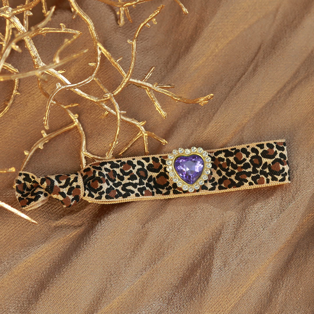 Hübsches Leopardenarmband mit einem Herzanhänger aus Strasssteinen in lila Farbe.