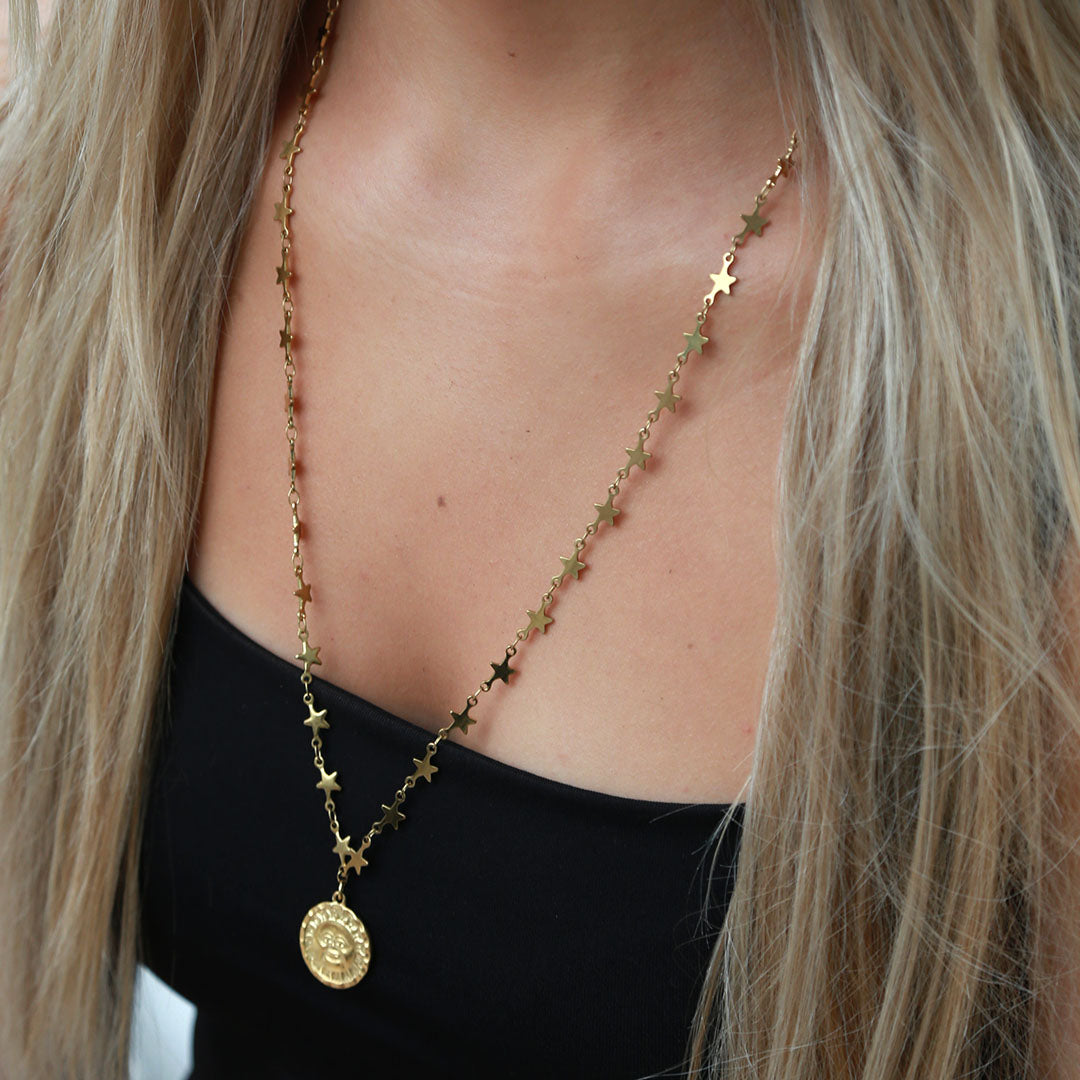 Gouden ketting met sterretjes en een gouden bedeltje met een maan en zon. Het is een lange ketting waardoor deze perfect te combineren is met andere kettingen!