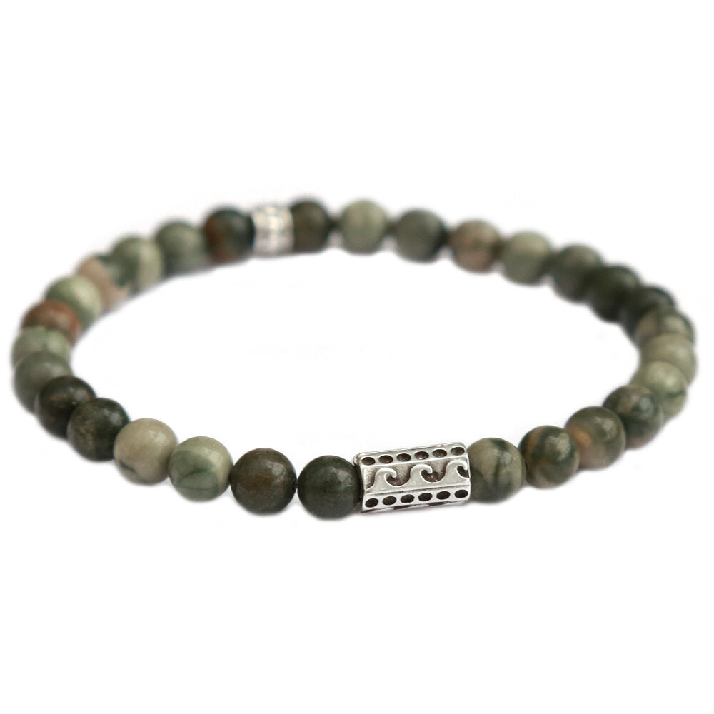 Elastisch kralenarmband van donkergroene Jasper edelsteenkralen met een stoere zilveren waves bedel.Maat: One sizeMateriaal: Elastiek, edelsteenkralen