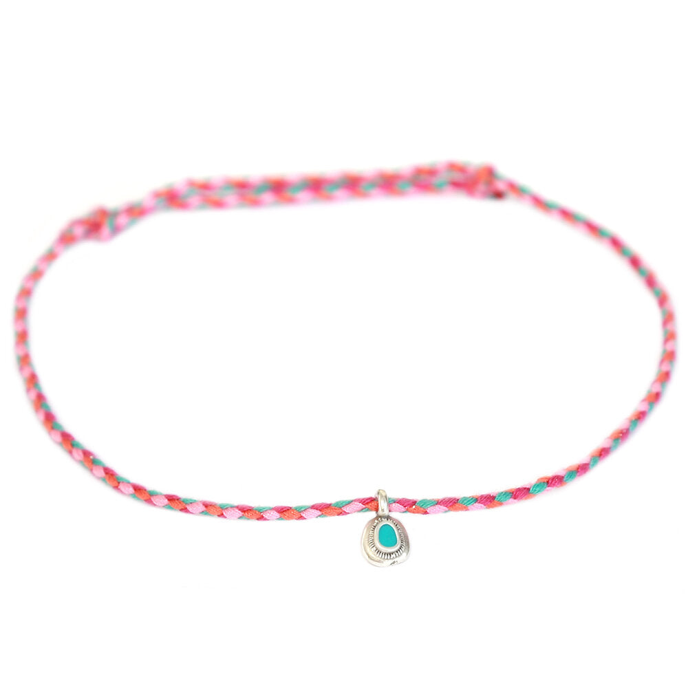 Mooi enkelbandje van gekleurd koord met een zilver/turquoise bedel.