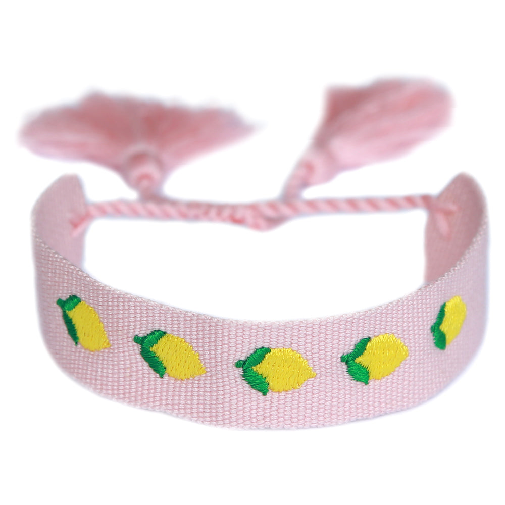 Leuke roze geweven armbandje met kleine citroentje. Je kunt hem makkelijk op maat schuiven.