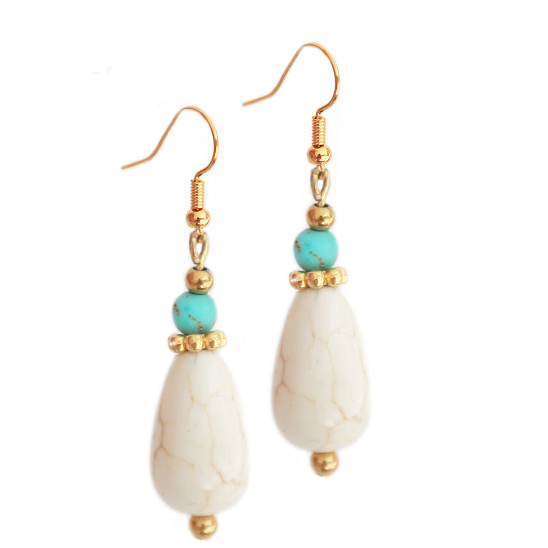Leuke handgemaakte oorbellen met een creme natuursteentje in de vorm van een druppel.