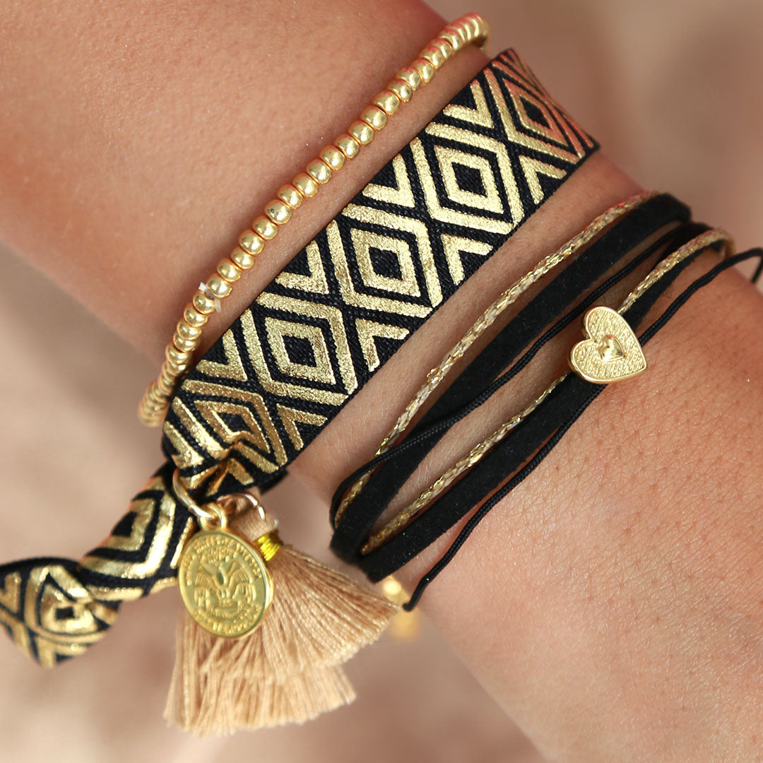 Leuk wrap armbandjes van zwarte en gouden touwtjes met een hartjes bedel. Het armbandje heeft een verlengkettinkje en is dus geschikt voor iedere pols.
