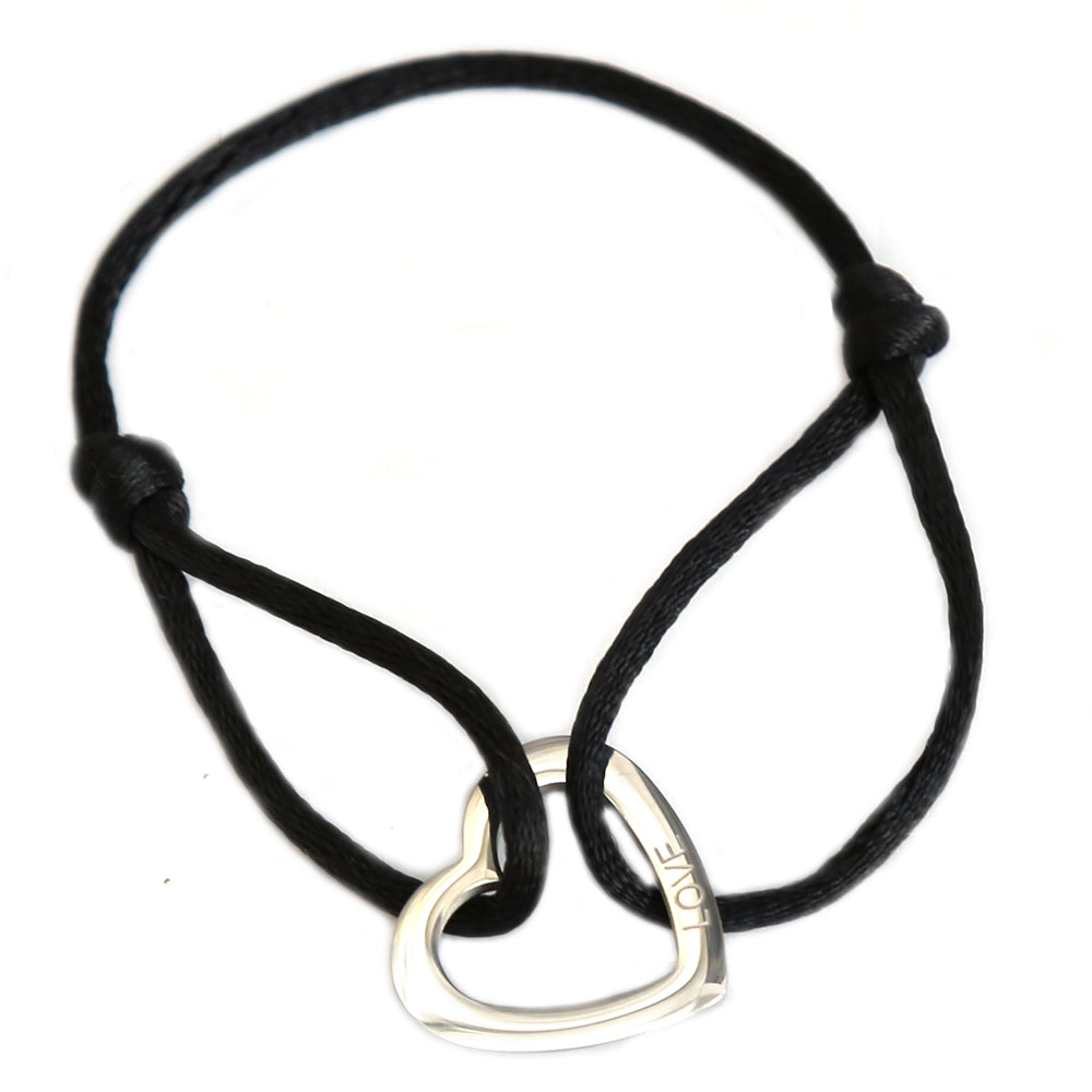 Black silk bracelet with a heart-shaped charm with the text 'LOVE'. You can adjust the bracelet to size!
