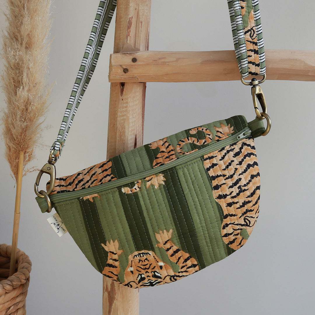 Cute crossbody bag in a great handmade block print. The bag has a matching zipper closure and an adjustable handle.