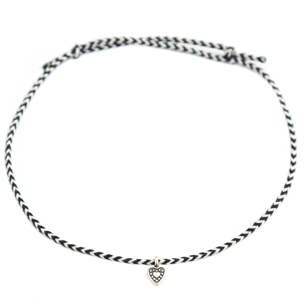 Beautiful anklet made of black and white twisted cotton cord with a silver heart charm.
