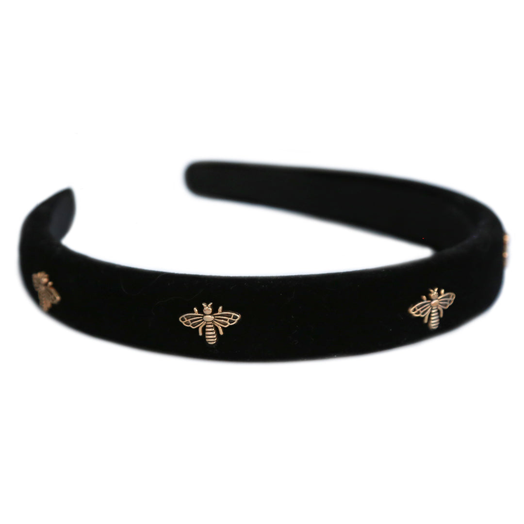 Beautiful velvet headband with cute bronze bees on it.