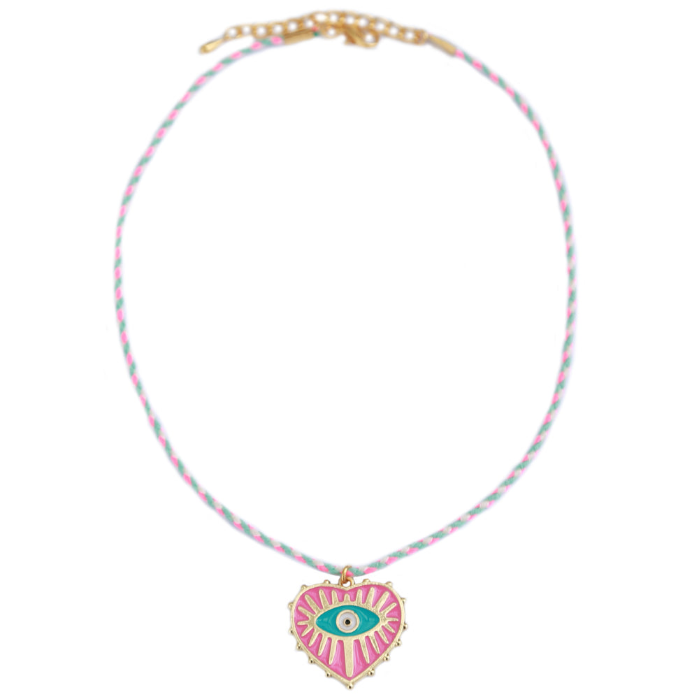 Nice string necklace in pink with a heart charm with an evil eye!