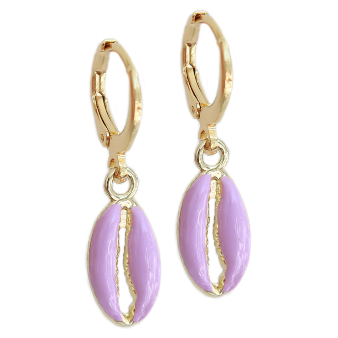 Cute golden earrings with a shell charm in a purple color!
