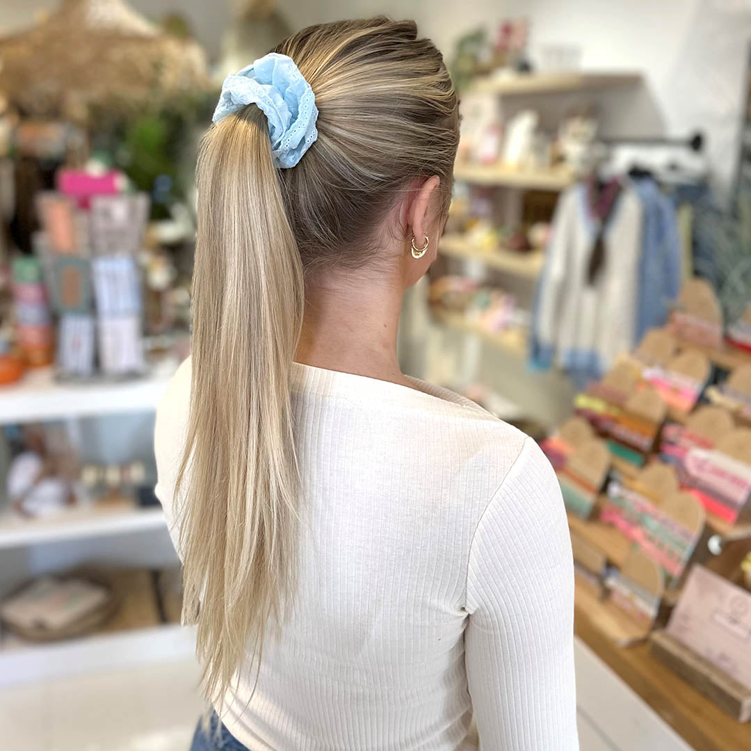 This blue embroidered scrunchie adds a fun twist to your ponytail or bun! Not only is the scrunchie great for your hair, it also looks great on your wrist.